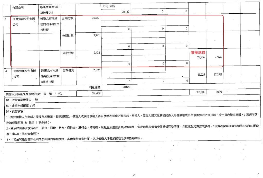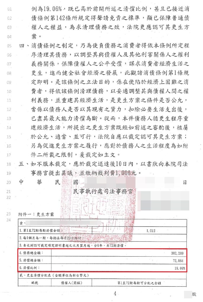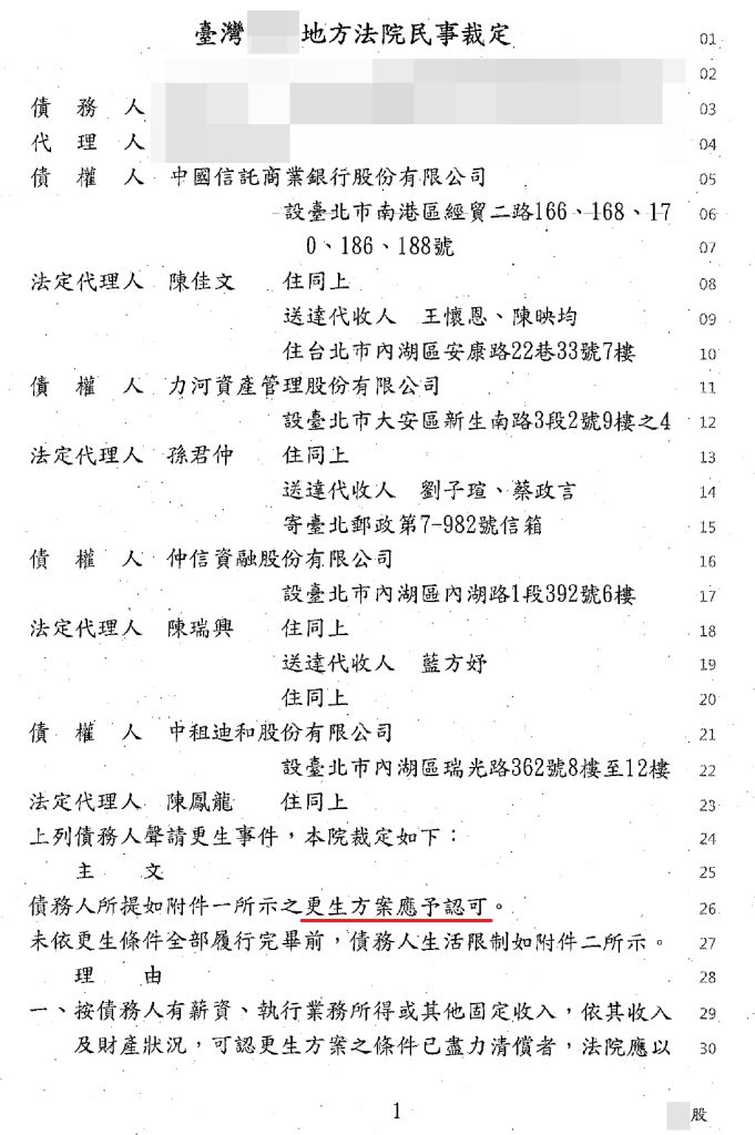 ■仲信資融公司債務協商、仲信資融更生『欠2.8萬、裁定5,544元、月付77元』 ■ 仲信資融貸款繳不起怎麼辦 1.申請協商或調整契約延長繳款期限。 2.仲信資融債務協商失敗可聲請更生。 ■ 什麼是債務更生程序 1.債務人提出6至8年還款計畫。 2.更生繳不起毀諾無法第2次更生。 ■ 債務更生好口碑 »»降債務低月付,儲蓄薪資有餘力。 »»債務2.8萬,裁定5,544元(省2.3萬) 積欠仲信資融2.8萬 法院裁定5,544元