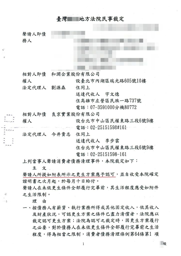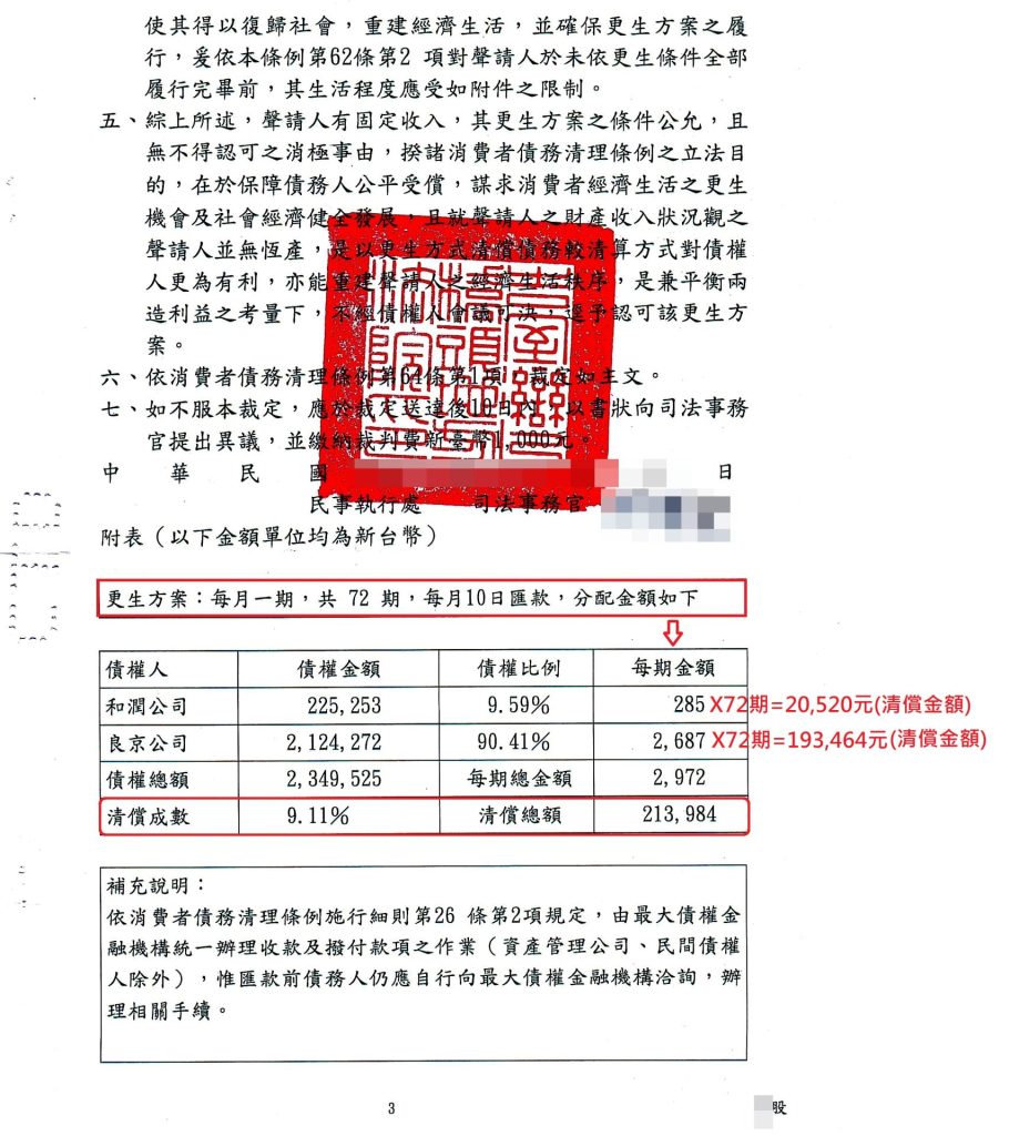 ■債務更生成功案例『債務234萬、更生裁定21萬、月付2,972、省213萬』 什麼是債務更生程序 ■ 何謂債務更生 : 每月收入扣除支出的餘額,分期6年償還債務的方案。 ■ 如何聲請更生 : 更生聲請狀及佐證資料(協商毀諾、調解不成立證明)。 ■ 債務更生優點 : 降總債務/保全財產/停止強制執行,可重新建立信用。 ■ 債務更生缺點 : 更生繳不起/更生毀諾,更生失敗無法第2次聲請更生。 降債務低月付 更生好口碑 ■ 債務234萬,更生裁定21萬 / 月付2,972元 (省213萬) 總債務更生裁定月付金省 234萬21萬2,972元213萬