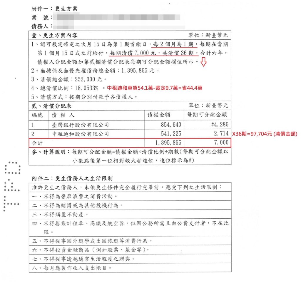 ■ 中租迪和車貸54.1萬,更生裁定9.7萬 / 每2個月付1次2,714元 (省44.4萬)
