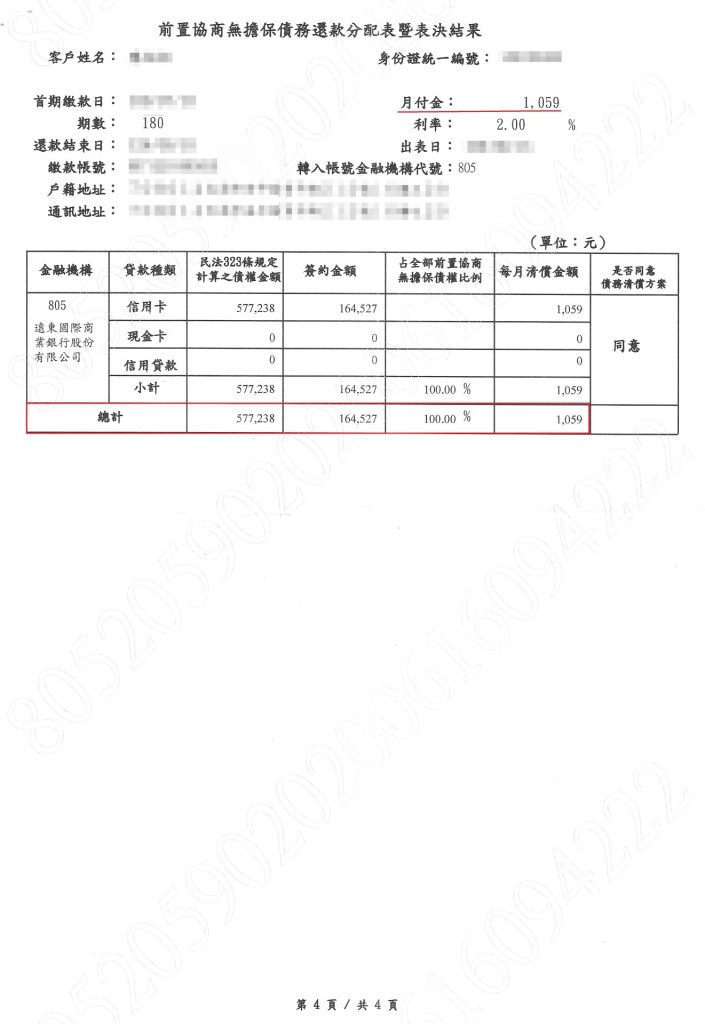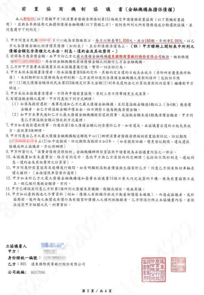 ■遠東銀行個別協商『原債務57萬、協商後16萬、月付1,059元、省41萬』 遠東銀行債務協商 ■ 單獨1家銀行,也能申請前置協商個別協議。 ■ 債務協商失敗或協商不成立,無法重新協商。 ■『協商不是破產』債務清償後,聯徵只註記1年。 債務協商失敗狀況 ■ 總債務沒有減少 : 只是將還款時間延長,毫無意義。 ■ 協商後負擔不起 : 協商月付金偏高,一樣無法減輕負擔。 ■ 協商分期高利率 : 隱藏協商陷阱,總清償金額高於債務本金。 降債務低月付 協商好口碑 ■ 債務57萬,協商後16萬 / 月付1,059元 (省41萬) 原債務協商後月付金省 57萬16萬1,059元41萬 完整協商案例 請親洽事務所